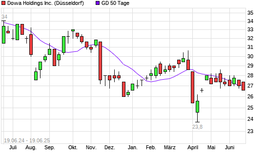 Mit dem Rücksetzer auf 27,20 EUR hat die Dowa Holdings-Aktie am 18.06.2025 die 50-Tage-Linie nach unten gekreuzt.