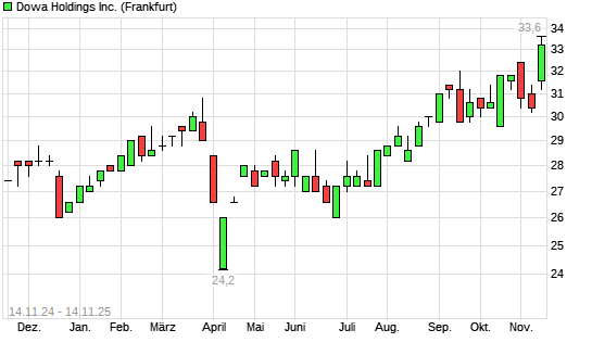Mit dem Anstieg auf 33,60 EUR hat die Dowa Holdings-Aktie (ISIN JP3638600001) am 13.11.2025 ein neues 12-Monats-Hoch erreicht und damit den Kurs vom 12.11.2025 eingestellt.Die Dowa Holdings-Aktie ...weiterlesen