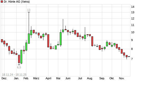Mit dem Rücksetzer auf 7,04 EUR hat die Dr. Hönle-Aktie (ISIN DE0005157101) am 17.11.2025 ein neues 6-Monats-Tief erreicht und damit den Kurs vom 06.11.2025 eingestellt.