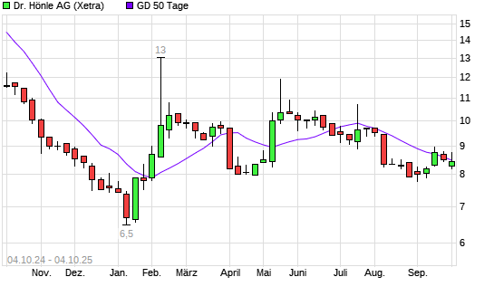 Mit dem Anstieg auf 8,48 EUR hat die Dr. Hönle-Aktie am 03.10.2025 die 50-Tage-Linie nach oben gekreuzt.