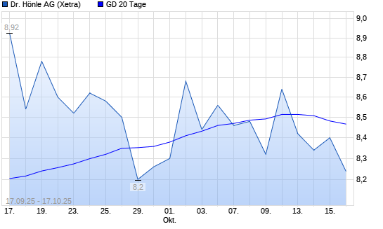 Mit dem Rücksetzer auf 8,32 EUR hat die Dr. Hönle-Aktie am 16.10.2025 die 20-Tage-Linie nach unten gekreuzt.