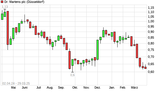 Mit dem Rücksetzer auf 0,59 EUR hat die Dr. Martens-Aktie (ISIN GB00BL6NGV24) am 28.03.2025 ein neues 6-Monats-Tief erreicht und damit den Kurs vom 21.03.2025 eingestellt.