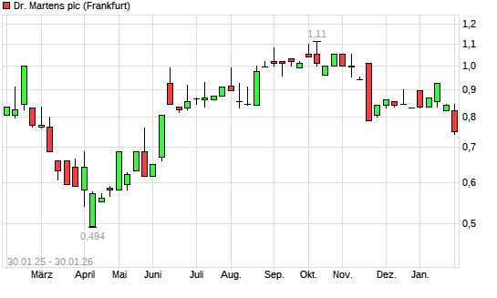 Mit dem Rücksetzer auf 0,74 EUR hat die Dr. Martens-Aktie (ISIN GB00BL6NGV24) am 29.01.2026 ein neues 6-Monats-Tief erreicht und damit den Kurs vom 21.11.2025 eingestellt.