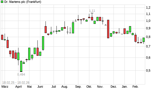 Mit dem Rücksetzer auf 0,73 EUR hat die Dr. Martens-Aktie (ISIN GB00BL6NGV24) am 17.02.2026 ein neues 6-Monats-Tief erreicht und damit den Kurs vom 29.01.2026 eingestellt.