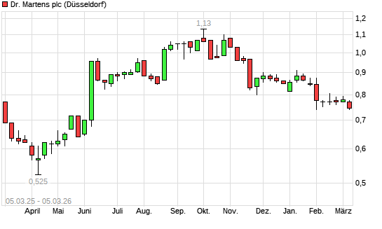Mit dem Rücksetzer auf 0,71 EUR hat die Dr. Martens-Aktie (ISIN GB00BL6NGV24) am 04.03.2026 ein neues 6-Monats-Tief erreicht und damit den Kurs vom 17.02.2026 eingestellt.