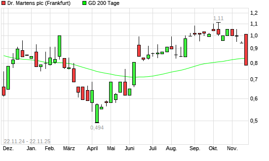 Mit dem Rücksetzer auf 0,79 EUR hat die Dr. Martens-Aktie am 21.11.2025 die 200-Tage-Linie nach unten gekreuzt.