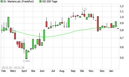Mit dem Rücksetzer auf 0,82 EUR hat die Dr. Martens-Aktie am 19.01.2026 die 200-Tage-Linie nach unten gekreuzt.