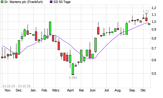 Mit dem Rücksetzer auf 0,96 EUR hat die Dr. Martens-Aktie am 13.10.2025 die 50-Tage-Linie nach unten gekreuzt.