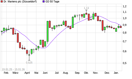 Mit dem Rücksetzer auf 0,86 EUR hat die Dr. Martens-Aktie am 14.01.2026 die 50-Tage-Linie nach unten gekreuzt.