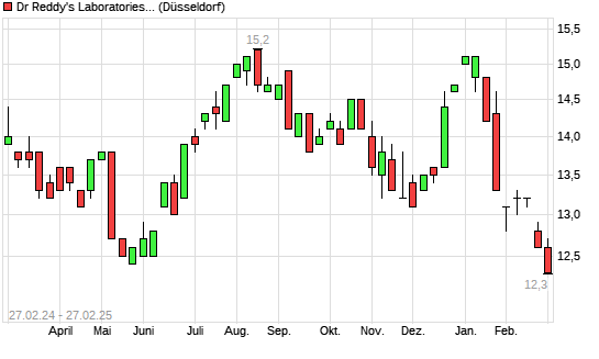 Mit dem Rücksetzer auf 12,30 EUR hat die Dr Reddy's Laboratories-Aktie (ISIN US2561352038) am 26.02.2025 ein neues 12-Monats-Tief erreicht und damit den Kurs vom 20.05.2024 eingestellt.