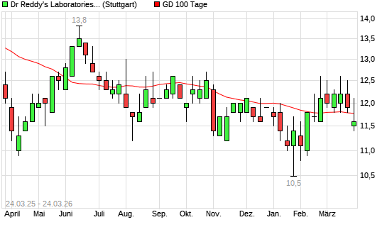 Mit dem Rücksetzer auf 11,70 EUR hat die Dr Reddy's Laboratories-Aktie am 23.03.2026 die 100-Tage-Linie nach unten gekreuzt.