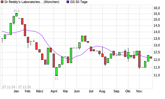 Mit dem Rücksetzer auf 11,90 EUR hat die Dr Reddy's Laboratories-Aktie am 26.11.2025 die 50-Tage-Linie nach unten gekreuzt.