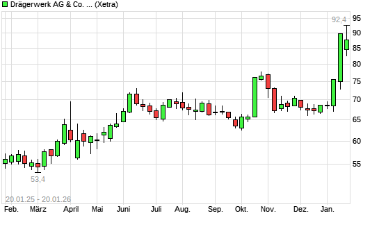 Mit dem Anstieg auf 90,40 EUR hat die Drägerwerk Vz-Aktie (ISIN DE0005550636) am 19.01.2026 ein neues 5-Jahres-Hoch erreicht und damit den Kurs vom 16.01.2026 eingestellt.