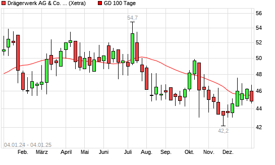 Mit dem Rücksetzer auf 45,15 EUR hat die Drägerwerk Vz-Aktie am 03.01.2025 die 100-Tage-Linie nach unten gekreuzt.