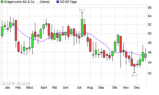 Mit dem Rücksetzer auf 44,55 EUR hat die Drägerwerk Vz-Aktie am 20.12.2024 die 50-Tage-Linie nach unten gekreuzt.