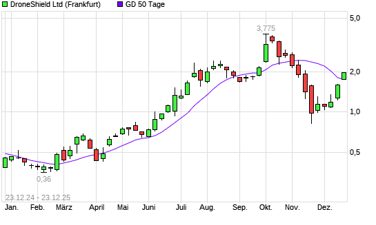 Mit dem Anstieg auf 1,81 EUR hat die DroneShield-Aktie am 22.12.2025 die 50-Tage-Linie nach oben gekreuzt.Die DroneShield-Aktie befindet sich seit dem 19.12.2025 im langfristigen Aufwärtstrend ...weiterlesen