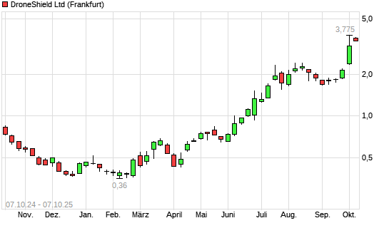 Mit dem Anstieg auf 3,60 EUR hat die DroneShield-Aktie (ISIN AU000000DRO2) am 06.10.2025 ein neues All-Time-High erreicht und damit den Kurs vom 01.10.2025 eingestellt.Der Abstand zur 200-Tage-Linie ...weiterlesen