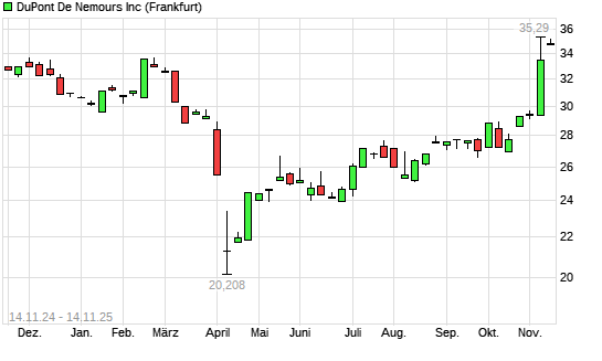 Mit dem Anstieg auf 35,20 EUR hat die DuPont-Aktie (ISIN US26614N1028) am 13.11.2025 ein neues 5-Jahres-Hoch erreicht und damit den Kurs vom 11.11.2025 eingestellt.