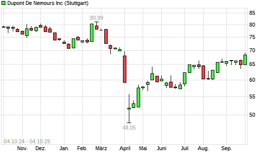 Mit dem Anstieg auf 69,02 EUR hat die DuPont-Aktie (ISIN US26614N1028) am 03.10.2025 ein neues 6-Monats-Hoch erreicht und damit den Kurs vom 02.10.2025 eingestellt.