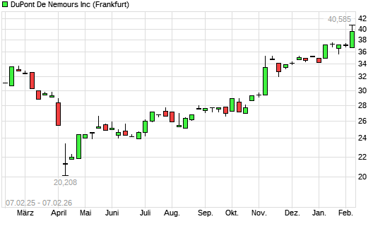 Mit dem Anstieg auf 39,51 EUR hat die DuPont-Aktie (ISIN US26614N1028) am 06.02.2026 ein neues All-Time-High erreicht und damit den Kurs vom 05.02.2026 eingestellt.