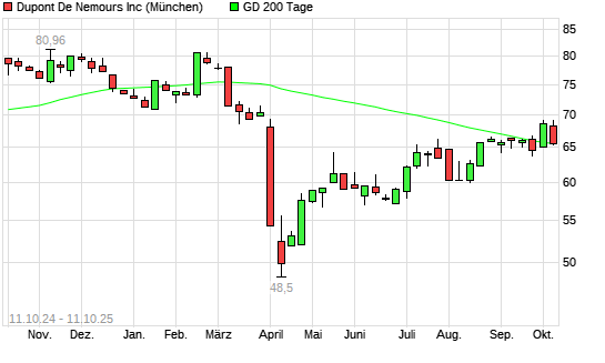 Mit dem Rücksetzer auf 65,00 EUR hat die DuPont-Aktie am 10.10.2025 die 200-Tage-Linie nach unten gekreuzt.