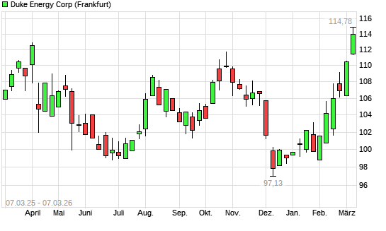Mit dem Anstieg auf 113,96 EUR hat die Duke Energy-Aktie (ISIN US26441C2044) am 06.03.2026 ein neues All-Time-High erreicht und damit den Kurs vom 04.03.2026 eingestellt.