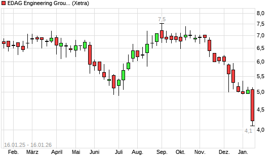 Mit dem Rücksetzer auf 4,50 EUR hat die EDAG Engineering Group-Aktie (ISIN CH0303692047) am 15.01.2026 ein neues All-Time-Low erreicht und damit den Kurs vom 14.01.2026 eingestellt.