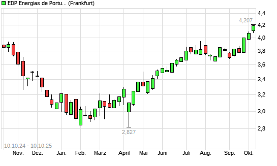 Mit dem Anstieg auf 4,19 EUR hat die EDP-Aktie (ISIN PTEDP0AM0009) am 09.10.2025 ein neues 12-Monats-Hoch erreicht und damit den Kurs vom 06.10.2025 eingestellt.