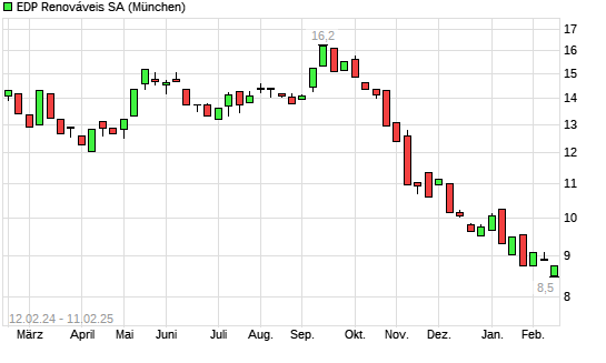 Mit dem Rücksetzer auf 8,44 EUR hat die EDP Renováveis-Aktie (ISIN ES0127797019) am 10.02.2025 ein neues 5-Jahres-Tief erreicht und damit den Kurs vom 24.01.2025 eingestellt.