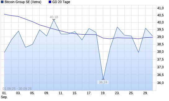 Mit dem Anstieg auf 39,32 EUR hat die Bitcoin Group-Aktie am 29.09.2025 die 20-Tage-Linie nach oben gekreuzt.Die Bitcoin Group-Aktie befindet sich seit dem 25.07.2025 im langfristigen Abwärtstrend ...weiterlesen