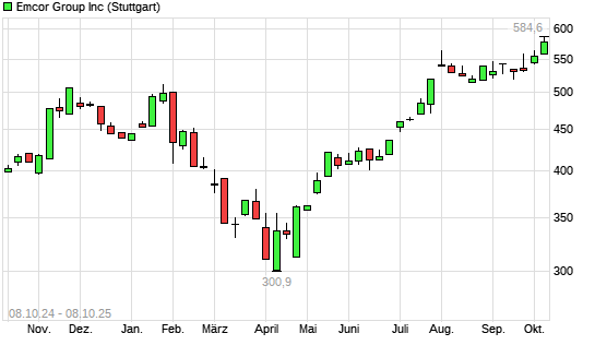Mit dem Anstieg auf 574,40 EUR hat die EMCOR Group-Aktie (ISIN US29084Q1004) am 07.10.2025 ein neues All-Time-High erreicht und damit den Kurs vom 31.07.2025 eingestellt.