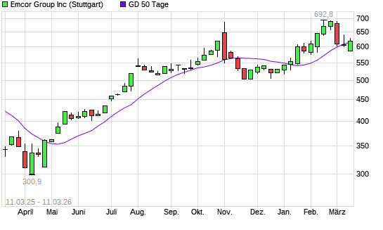 Mit dem Anstieg auf 612,00 EUR hat die EMCOR Group-Aktie am 10.03.2026 die 50-Tage-Linie nach oben gekreuzt.
