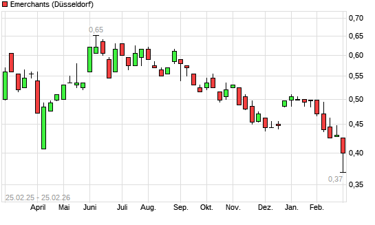 Mit dem Rücksetzer auf 0,41 EUR hat die EMERCHANTS-Aktie (ISIN AU000000EML7) am 24.02.2026 ein neues 12-Monats-Tief erreicht und damit den Kurs vom 07.04.2025 eingestellt.