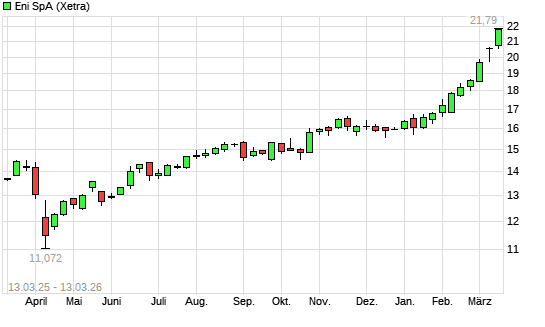 Mit dem Anstieg auf 21,84 EUR hat die ENI-Aktie (ISIN IT0003132476) am 12.03.2026 ein neues 10-Jahres-Hoch erreicht und damit den Kurs vom 11.03.2026 eingestellt.