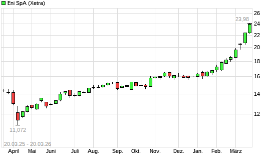 Mit dem Anstieg auf 23,85 EUR hat die ENI-Aktie (ISIN IT0003132476) am 19.03.2026 ein neues 10-Jahres-Hoch erreicht und damit den Kurs vom 17.03.2026 eingestellt.