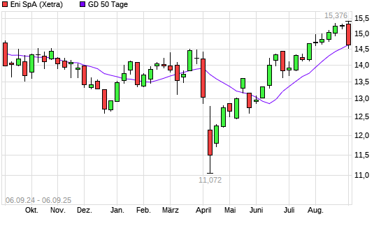 Mit dem Rücksetzer auf 14,61 EUR hat die ENI-Aktie am 05.09.2025 die 50-Tage-Linie nach unten gekreuzt.