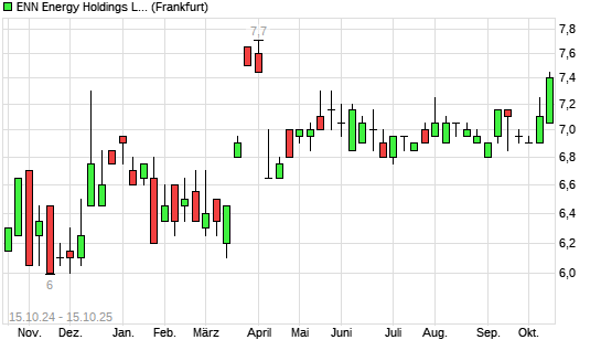 Mit dem Anstieg auf 7,45 EUR hat die ENN ENERGY HOLDINGS-Aktie (ISIN KYG3066L1014) am 14.10.2025 ein neues 6-Monats-Hoch erreicht und damit den Kurs vom 22.05.2025 eingestellt.