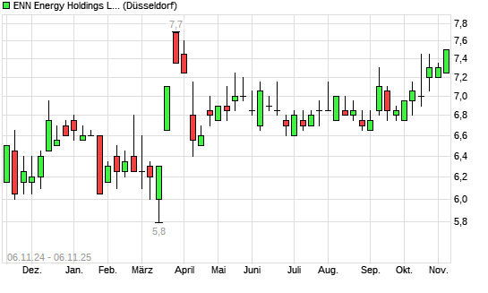 Mit dem Anstieg auf 7,55 EUR hat die ENN ENERGY HOLDINGS-Aktie (ISIN KYG3066L1014) am 05.11.2025 ein neues 6-Monats-Hoch erreicht und damit den Kurs vom 04.11.2025 eingestellt.