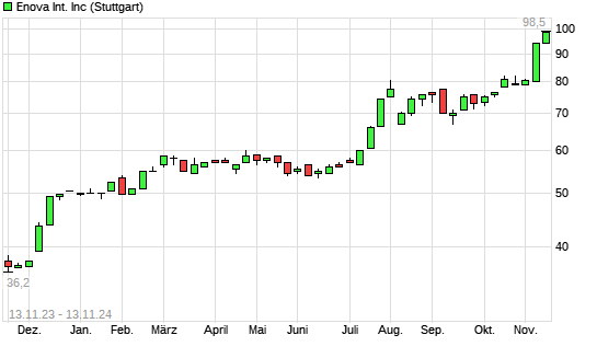 Mit dem Anstieg auf 97,00 EUR hat die ENOVA INTL-Aktie (ISIN US29357K1034) am 12.11.2024 ein neues All-Time-High erreicht und damit den Kurs vom 07.11.2024 eingestellt.