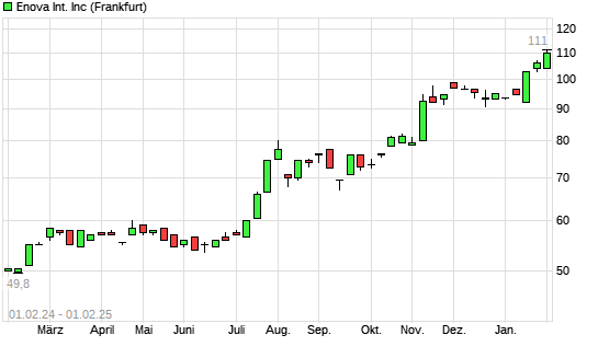 Mit dem Anstieg auf 111,00 EUR hat die ENOVA INTL-Aktie (ISIN US29357K1034) am 31.01.2025 ein neues All-Time-High erreicht und damit den Kurs vom 30.01.2025 eingestellt.