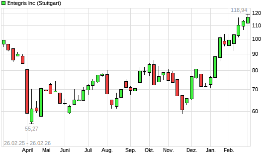 Mit dem Anstieg auf 115,94 EUR hat die ENTEGRIS-Aktie (ISIN US29362U1043) am 25.02.2026 ein neues 12-Monats-Hoch erreicht und damit den Kurs vom 24.02.2026 eingestellt.