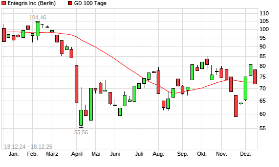 Mit dem Rücksetzer auf 72,37 EUR hat die ENTEGRIS-Aktie am 17.12.2025 die 100-Tage-Linie nach unten gekreuzt.