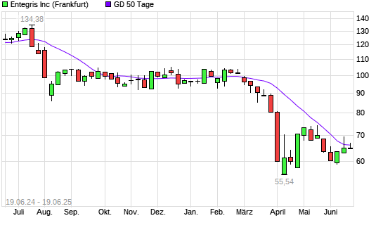 Mit dem Rücksetzer auf 65,93 EUR hat die ENTEGRIS-Aktie am 18.06.2025 die 50-Tage-Linie nach unten gekreuzt.