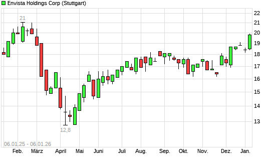Mit dem Anstieg auf 19,20 EUR hat die ENVISTA HOLDINGS-Aktie (ISIN US29415F1049) am 05.01.2026 ein neues 6-Monats-Hoch erreicht und damit den Kurs vom 22.12.2025 eingestellt.