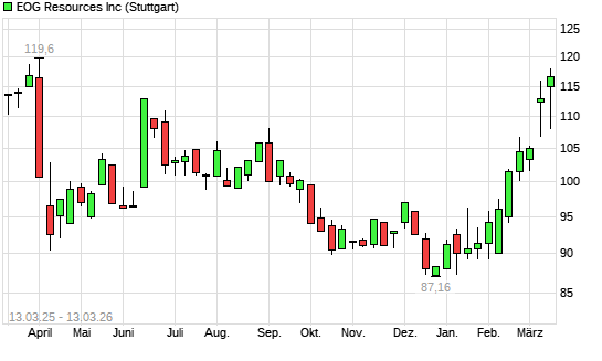 Mit dem Anstieg auf 114,62 EUR hat die EOG Resources-Aktie (ISIN US26875P1012) am 12.03.2026 ein neues 6-Monats-Hoch erreicht und damit den Kurs vom 11.03.2026 eingestellt.