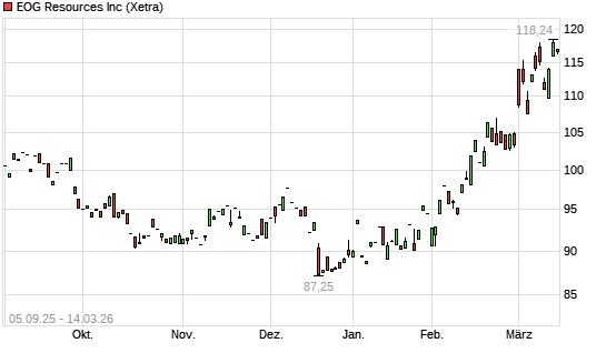 Mit dem Anstieg auf 115,58 EUR hat die EOG Resources-Aktie (ISIN US26875P1012) am 13.03.2026 ein neues 6-Monats-Hoch erreicht und damit den Kurs vom 12.03.2026 eingestellt.
