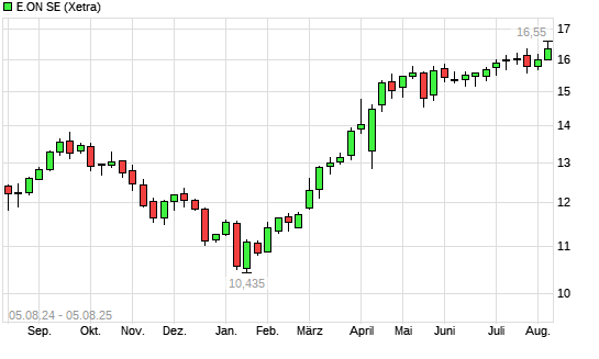Mit dem Anstieg auf 16,43 EUR hat die E.ON-Aktie (ISIN DE000ENAG999) am 04.08.2025 ein neues 10-Jahres-Hoch erreicht und damit den Kurs vom 22.07.2025 eingestellt.