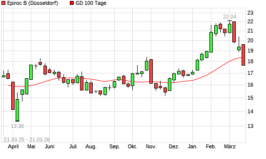Mit dem Rücksetzer auf 17,83 EUR hat die EPIROC AB B-Aktie am 20.03.2026 die 100-Tage-Linie nach unten gekreuzt.
