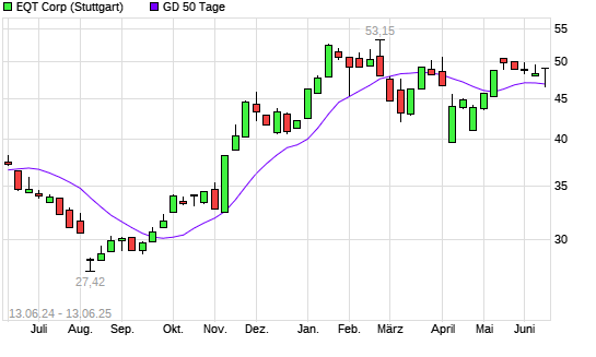 Mit dem Rücksetzer auf 46,49 EUR hat die EQT-Aktie am 12.06.2025 die 50-Tage-Linie nach unten gekreuzt.