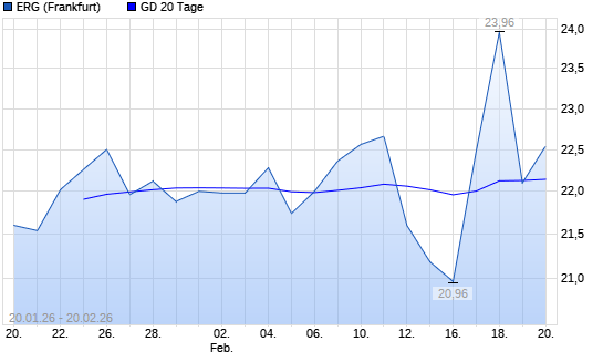 Mit dem Rücksetzer auf 22,10 EUR hat die ERG-Aktie am 19.02.2026 die 20-Tage-Linie nach unten gekreuzt.Der Abstand zur 200-Tage-Linie beträgt aktuell +8,12%. Die ...weiterlesen